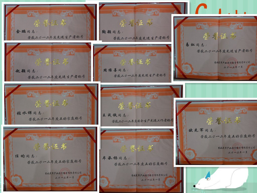 榮獲二○一二年度“先進(jìn)生產(chǎn)者”稱(chēng)號(hào):陶穎、金鵬、周維善、趙穎、易虹